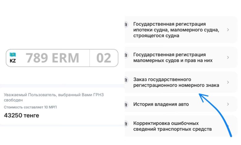 Мемлекеттік тіркеу нөміріне тапсырысты eGov Mobile қосымшасы немесе eGov.kz сайты арқылы беруге болады. Ол үшін электрондық цифрлық қолтаңба қажет. Қызмет түрінен «Мемлекеттік тіркеу нөмірлік белгісіне тапсырыс беру» бөлімін таңдап, қалаған комбинацияны енгізесіз. Жүйе бағаны автоматты түрде көрсетеді. Одан кейін нөмірді алатын органды таңдап, төлем жасайсыз.