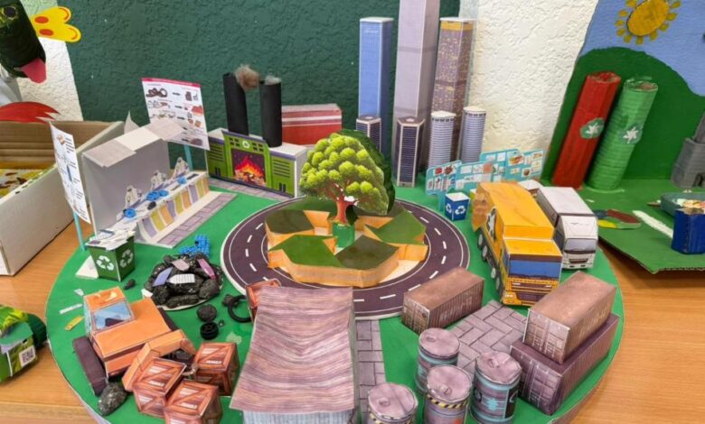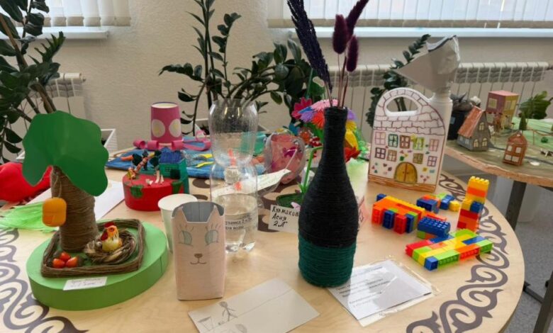 «Қайта өңдеу – болашаққа қадам» көрмесінде оқушылар мен ата-аналар тұрмыстық қалдықтардан жасалған қолданбалы бұйымдарын ұсынып, қалдықтарды қайта өңдеудің маңызын көрсетті.