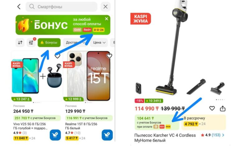 Бұл Kaspi Gold-пен, Kaspi Red+ арқылы, сондай-ақ кредитке немесе бөліп төлеуге жасалған сатып алуларға қатысты. Ал Kaspi Жұма кезінде жоғарылатылған бонустар 60%-ға дейін жетеді.