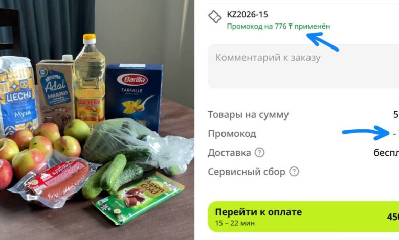 Маңызды: промокод іске қосылуы үшін минималды сома (5000₸ немесе 6000₸) акциясыз тауарлардан жиналуы керек. Жеңілдікпен берілетін дайын тағамдар бұл сомаға есептелмейді, сондықтан оларды себетке кейінірек қосқан дұрыс.