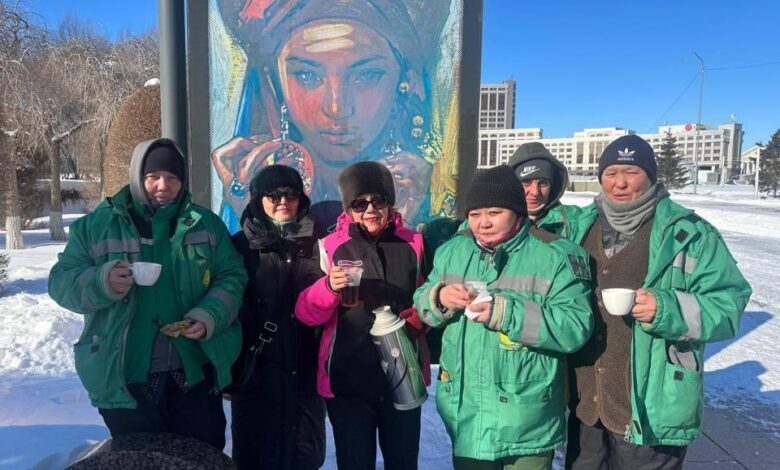 В морозный день работников, занятых уборкой города, угостили горячим чаем, баурсаками и сладкой выпечкой. Вместе с угощениями прозвучали искренние слова благодарности за их ответственность, самоотверженность и вклад в благоустройство столицы.